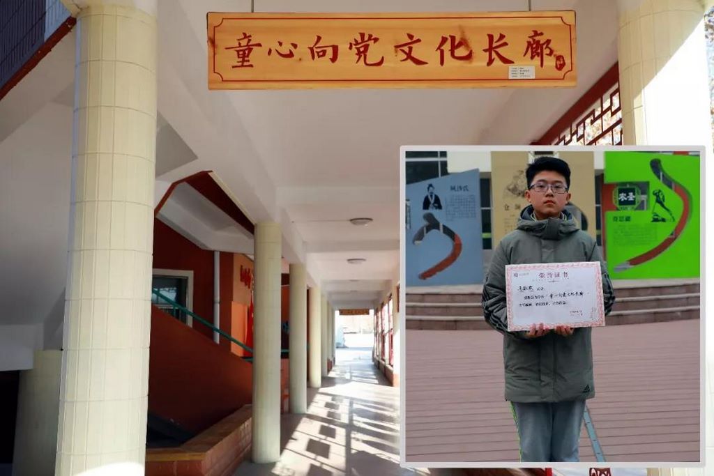 童心向党文化长廊 牌匾书写者:马钰钦(七年级八班) 位置:力行楼求知楼东连廊一楼 |