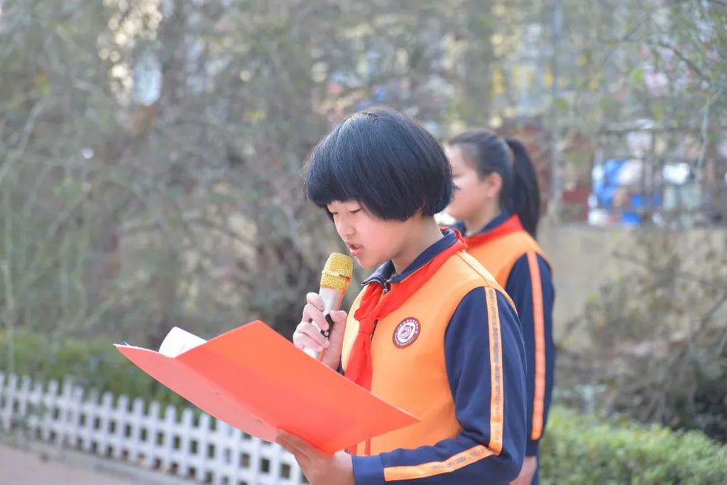 六(9)中队少先队员代表曹鲁冰在国旗下号召全体少先队员要坚定理想信念,树立“从小学先锋,长大当先锋”的信念,高举队旗跟党走,自信喊出“请党放心、强国有我”的时代最强音。要常怀助人之心,助人先从帮助父母做起,从不给他人添乱做起,从学会与他人分享做起。要不断创新进取,新时代学习雷锋要紧跟时代步伐,要坦然面对困难,欣然接受挑战,自然拥抱改变。要厉行勤俭节约,我们从节约每一张纸、每一支笔、每一滴水、每一口饭做起,以实际行动践行勤俭节约的美德。队员们要做雷锋精神的忠实传承者,社会主义核心价值观的模范践行者,“三圣教育·红色领航”党建品牌的内涵丰富者,用实际行动弘扬雷锋精神,让雷锋精神在圣中校园散发出新的光芒!