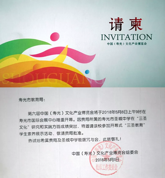 寿光历史文化悠久,人文底蕴深厚,“三圣”闻名遐迩。圣城中学立足办学实际,将“三圣文化”作为学校核心文化,经过近几年的不断创新实践,已构建起较完善的“三圣教育”课程体系,形成了浓郁的办学特色。成功打造了“三圣教育”特色品牌和“三圣教育·红色领航”党建品牌,成为“寿光三圣”在学校层面的积极传承者和践行者。为弘扬三圣精神,加强党建品牌建设,5月8日上午,圣城中学受邀参加第六届中国(寿光)文博会开幕式暨“三圣教育”学生核心素养展示活动。