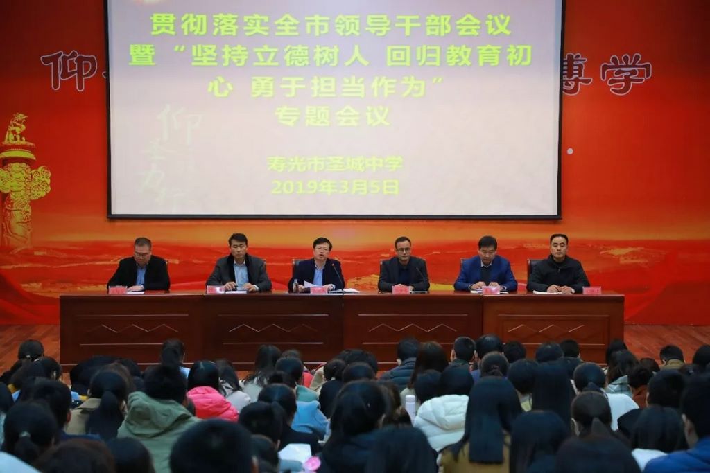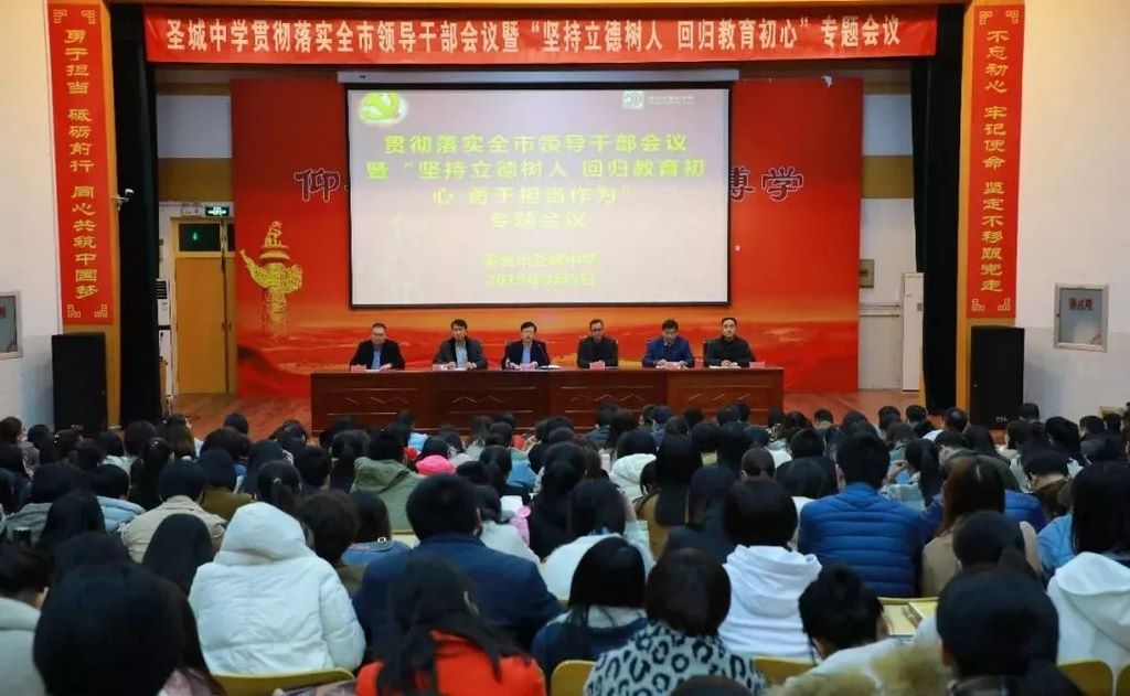 为倡导新风,凝聚正气,狠抓落实,从根本上扭转教职工的思想观念,办人民满意的教育。3月5日晚,圣城中学召开贯彻落实全市领导干部会议暨“坚持立德树人,回归教育初心,勇于担当作为”专题会议,全体教职工参加,副校长张金泉主持。