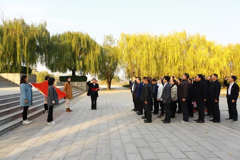 在牛头镇抗日武装起义纪念碑前。大家认真听取了教官对寿光红色峥嵘岁月的介绍。面对鲜艳的党旗,全体党员教师举起右拳,庄严宣誓,重温入党誓词,缅怀革命先烈,牢记入党初心,勇担历史使命。