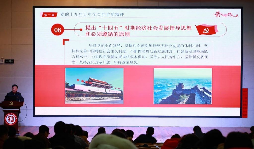 报告会上,齐永胜从五中全会基本情况和重大意义,四中全会以来的工作,全面把握新发展阶段,准确领会2035年远景目标和“十四五”时期我国发展的指导方针、主要目标、重点任务,深刻认识构建新发展格局,坚持党的全面领导,动员各方面力量为实现“十四五”规划和2035年远景目标而团结奋斗等方面,对党的十九届五中全会精神进行全面宣讲和深入解读。会议根据学校实际,安排了学习宣传贯彻五中全会精神的具体措施,并就意识形态工作进行了专题培训。
