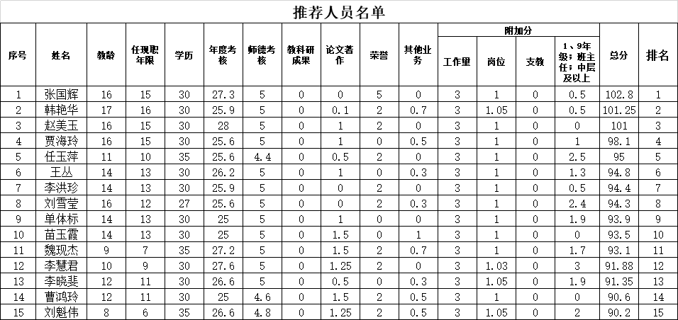 根据市职称工作安排,通过个人申报、递交材料、职称评审委员会组织评审、个人积分确认,最终将中级职称推荐人选公示如下,请予以监督,如对公示人员有问题反映,请于公示期以书面形式反馈。