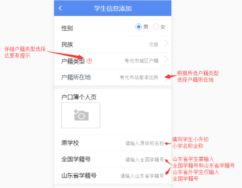 选择学生报名年级,如实填写学生的姓名、身份证号、性别、民族、户籍类型、户籍所在地等本信息并上传照片。一年级学生需上传接种证明照片,七年级学生需填写原学校、全国学籍号、山东省学籍号。如有特殊情况,请填写特殊情况说明。如图4(一年级)、图5(七年级)所示。