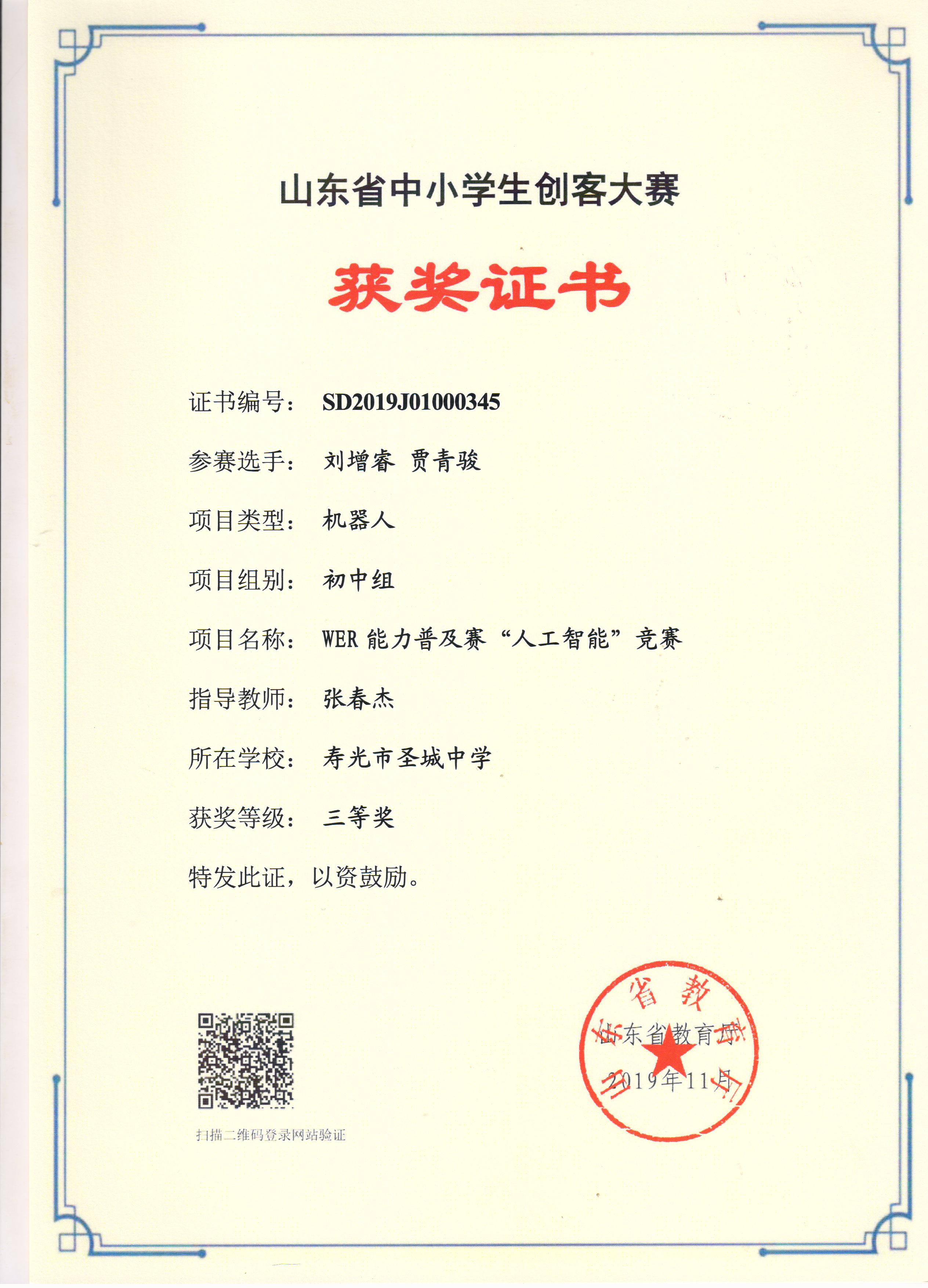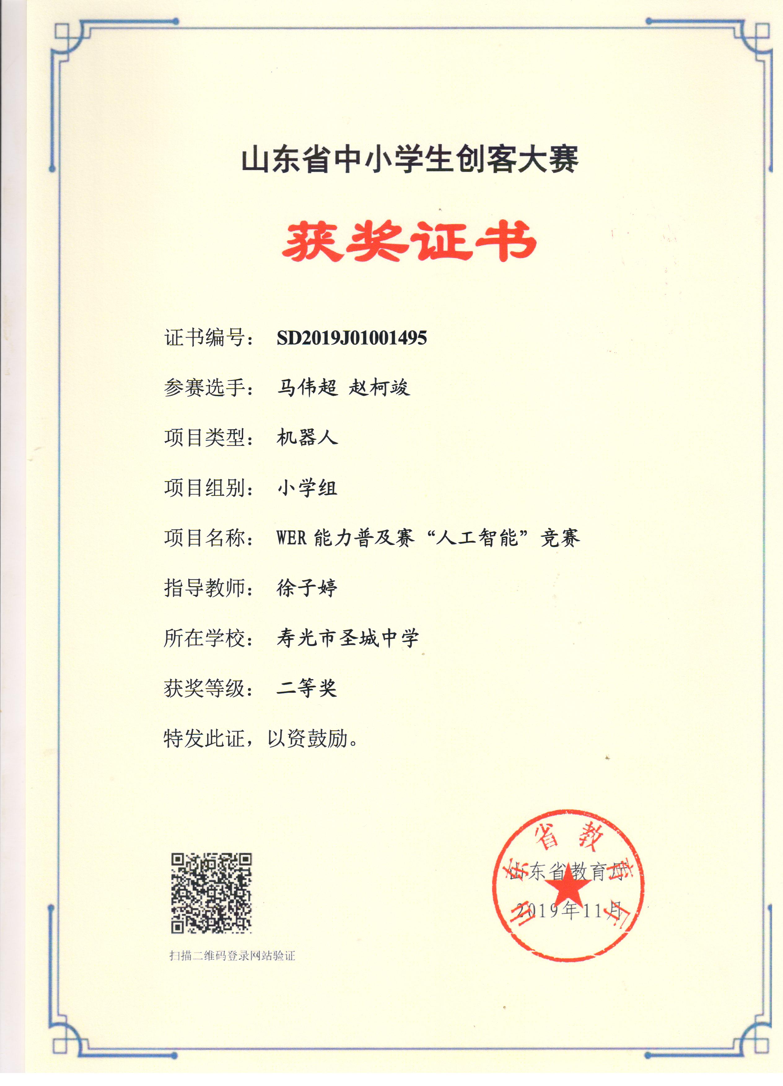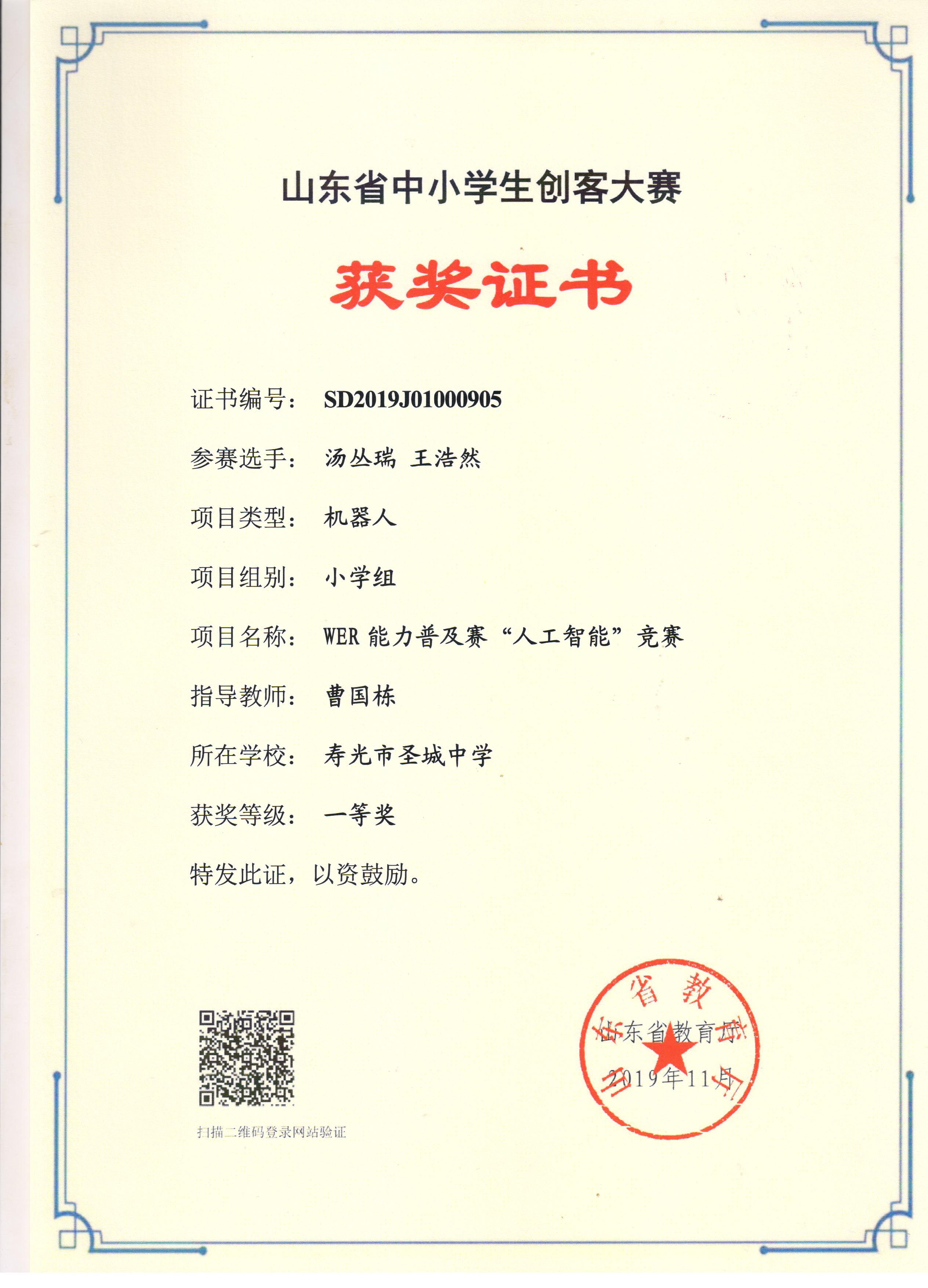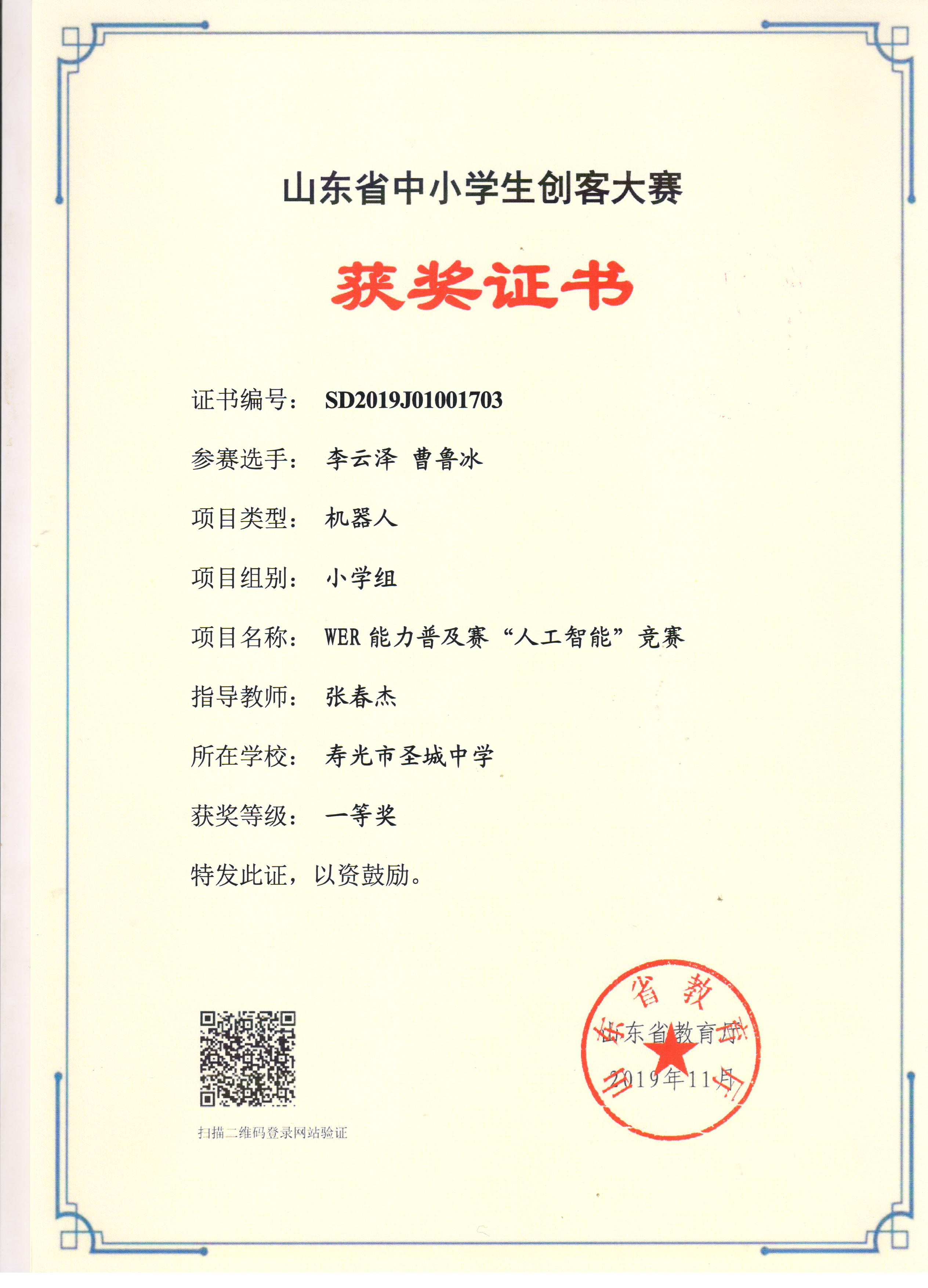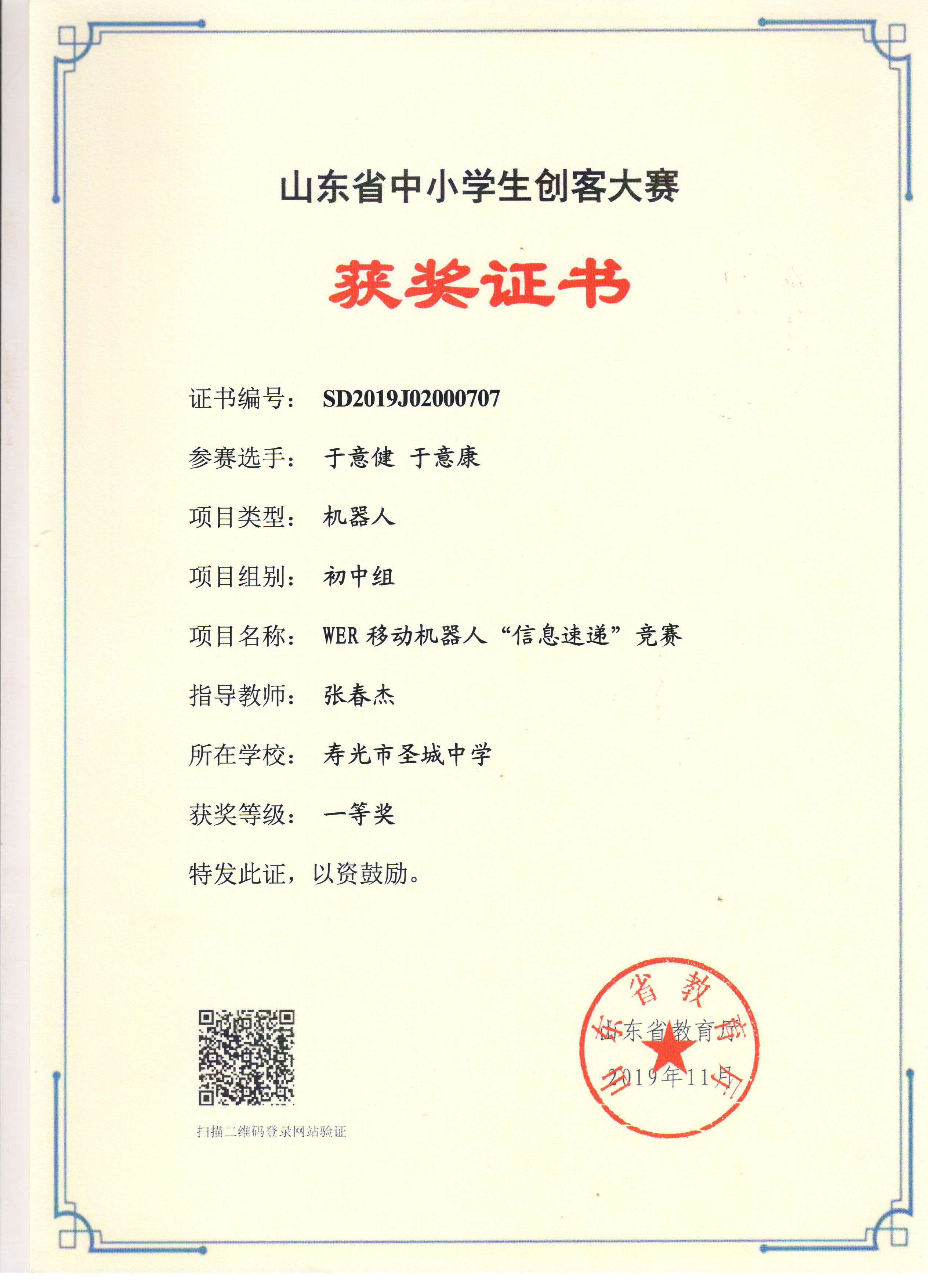 2019年山东省中小学机器人大赛活动我校获奖名单