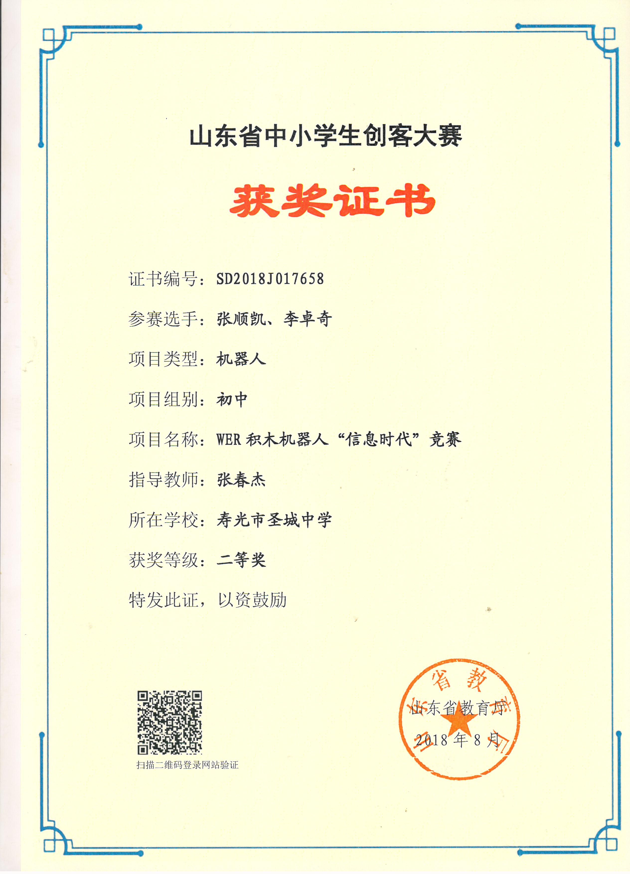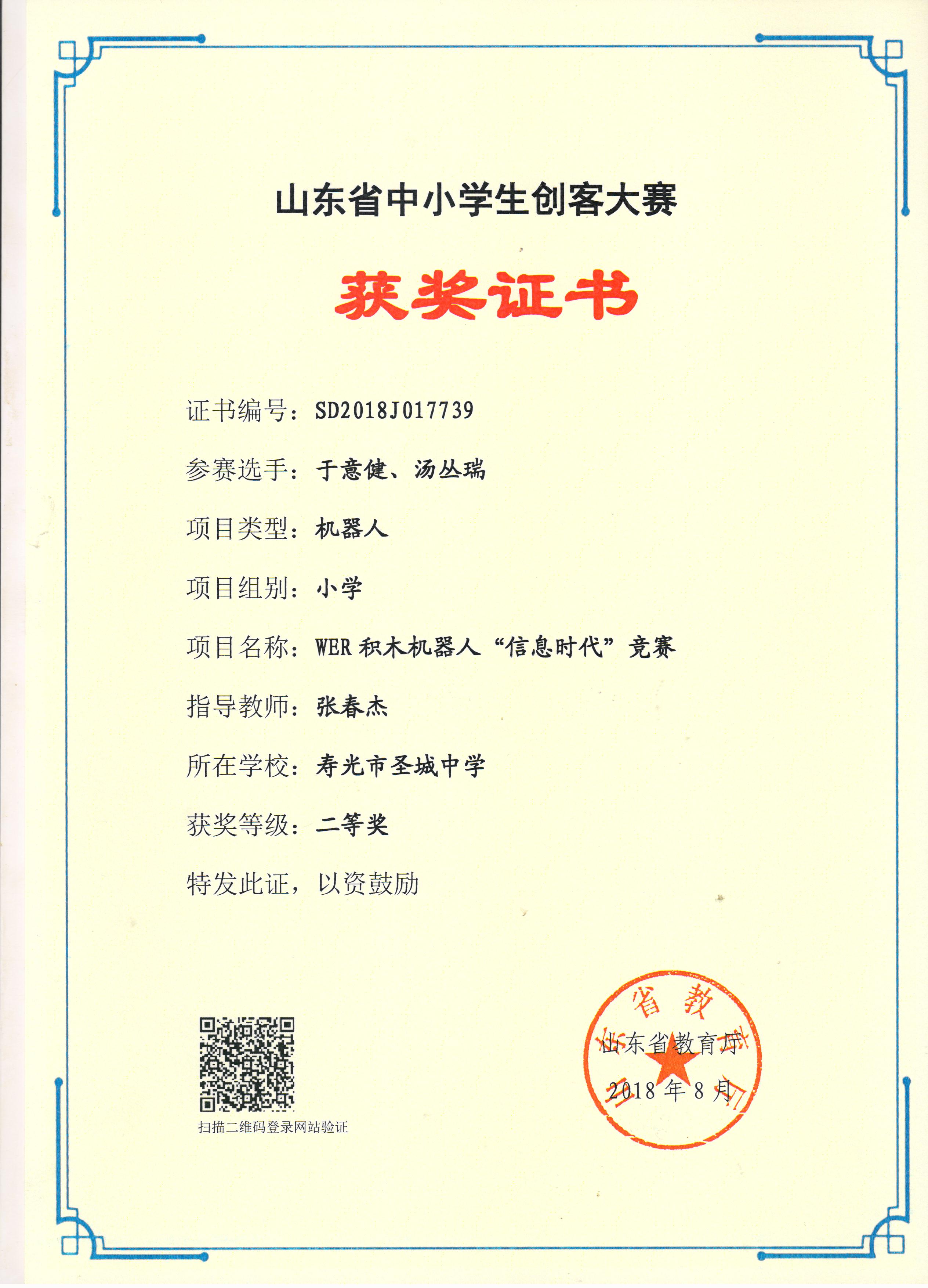 2018年山东省中小学机器人大赛活动我校获奖名单