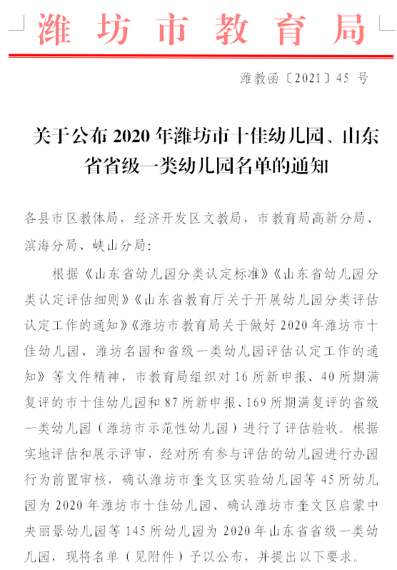 近日,潍坊市教育局发文,公布2020年潍坊市十佳幼儿园名单,寿光市圣城中学幼儿园被评为“潍坊市十佳幼儿园”。