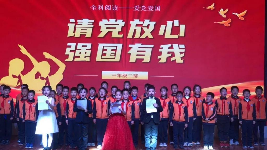 三年级一部的孩子们带来了诗歌表演《读唐诗》、绕口令、蒙学经典《古诗里的四季》、英语歌《One little finger》、朗诵《请党放心,强国有我》等节目。