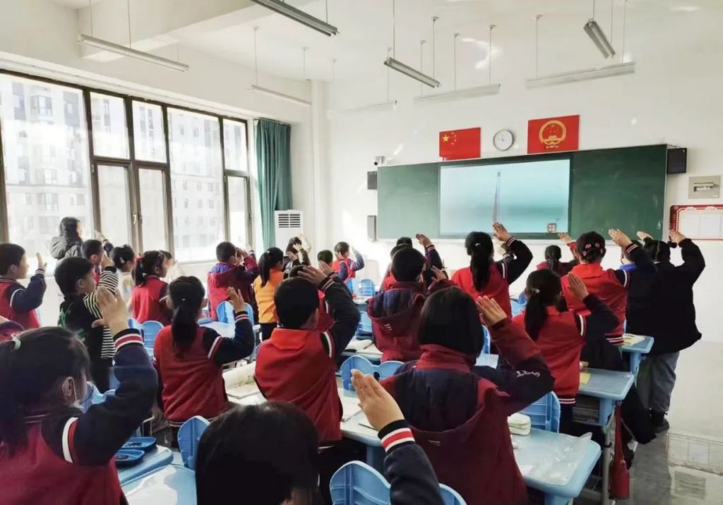 室外严寒,室内却热情满满。同学们观看了天安门广场升旗仪式的视频,整齐划一的动作、嘹亮的口号、庄严的氛围,无不令人感到振奋和激动,嘹亮庄严的国歌声回荡在每一名同学的心间。