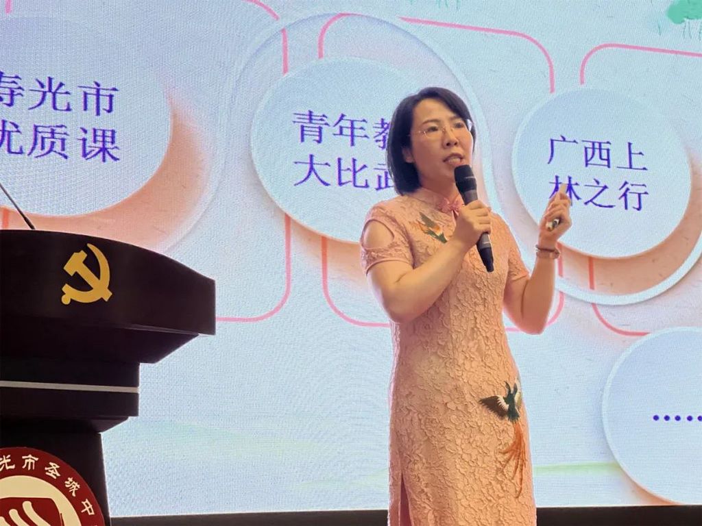 吴淑娴老师是寿光市学科带头人、寿光市教学能手。吴老师通过“优秀的人、优秀的团队、优秀的平台”展示了“与优秀同行,遇见更好的自己”。吴老师提到与优秀的人同行,自己才能一步步地提升。她分享了最近阅读的7本书籍,告诉大家不止步的学习,才会让自己更优秀。对于课堂,吴老师告诉老师们一定要读课标、读教材、读学生,只有全面的了解,才能实现教和学的一致性。