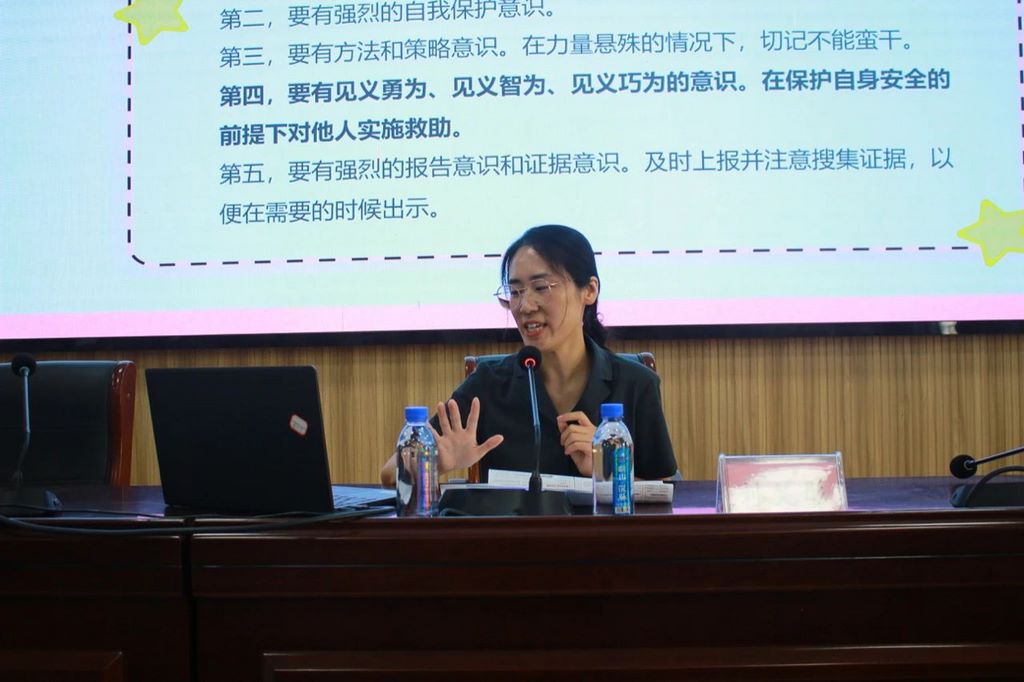 法制副校长刘笑彤从什么是校园欺凌、校园欺凌的危害以及如何正确应对校园欺凌三个方面展开讲解。通过以案说法,引导学生通过不同角度认识校园欺凌的危害,以及校园施暴者应承担的法律责任,教育引导学生增强自我保护意识,并通过正确的方法和策略保护自己,有效抵制校园欺凌的发生。