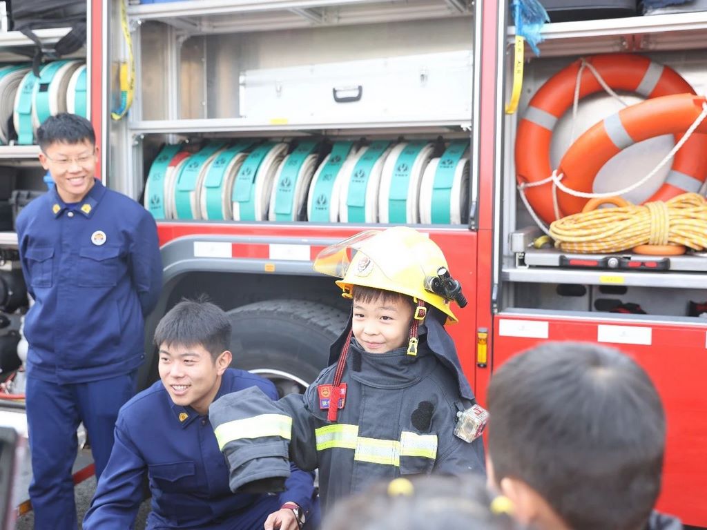 在室外,孩子们来到消防车前,一起近距离观察消防车的构造,通过观看、手摸、亲手操作等,来感受神秘的消防车,增强了学生对消防人员的敬佩和消防安全意识。学生们还穿上消防服,亲自体验了一把“救火英雄”的感觉,重重的消防服让学生真切体会到了消防员的辛苦与伟大。