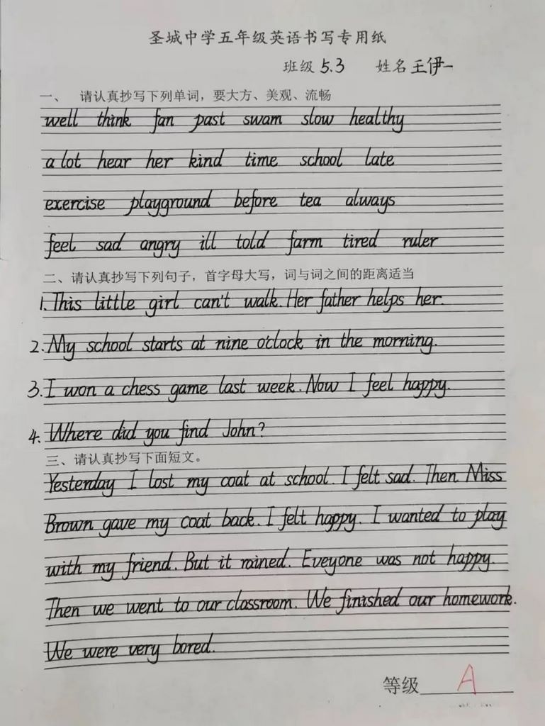 厚积薄发展风采,千锤百炼追卓越。同学们信心满满,坐姿端正,他们将平日训练的功力转化为赛场上的实力,字母书写标准,字迹流畅整洁,卷面排列得当。本次英语素养展示活动不但展现了同学们扎实的英语书写功底,更展现出了他们认真、积极的英语学习态度。加强英语书法的训练能够让同学们强化对教材的学习,促进语言的吸收。
