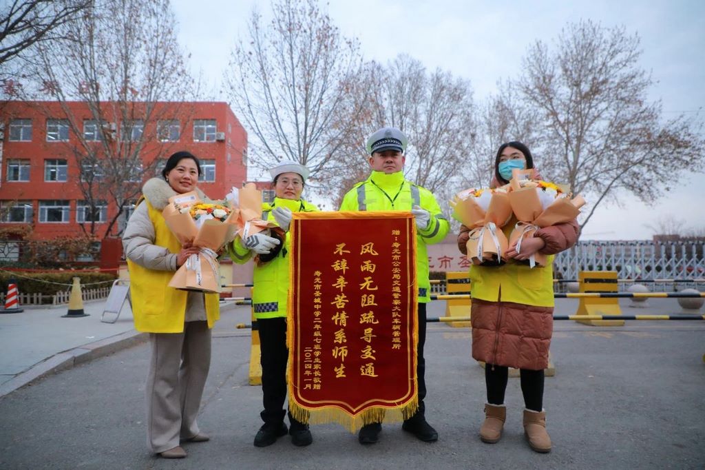 交警、家委会志愿者也纷纷加入到“133”行动中来,每天早上不到7:20,他们就早早来到学校大门口,穿梭在人流车流中指挥交通、护航学生,他们的无私奉献也感动了接送孩子的家长。一天清晨,在值完勤后,热心家长为风雨无阻的执勤交警送上了鲜花和锦旗,感恩感谢他们为孩子风雨无阻倾心相护,为孩子上放学安全保驾护航。