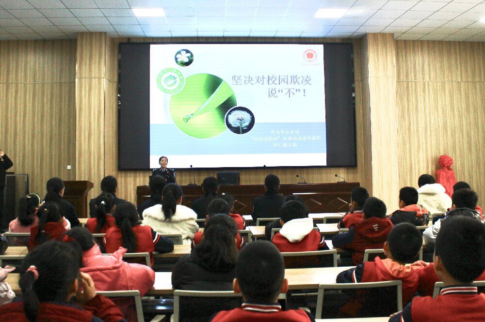 为进一步规范学生行为,保障学生身心健康,2月27日,圣城中学巨能校区邀请寿光市公安局法制大队进校园,为同学们进行了预防校园欺凌专题宣讲,三四年级全体师生参加。