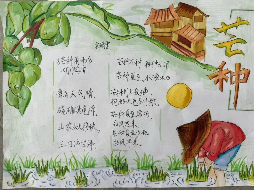 三四五年级的学生们则通过背诵关于芒种的诗词,感受古人对芒种节气的描绘和赞美。同时,他们还利用校园里丰富的树叶资源,制作了精美的树叶书签。孩子们在书签上绘制了芒种时节的风景和农作物,不仅锻炼了动手能力,也加深了对芒种节气的理解。