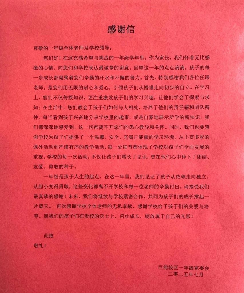 正如一年级家委会在饱含深情的感谢信中所言:“一年级是孩子人生的起点,在这一年里,我们见证了孩子从依赖走向独立,从胆小变得勇敢,这些变化都离不开学校和每一位老师的辛勤付出。”这番话语,道出了全体家长的心声。家长们纷纷表示,未来将继续与学校紧密携手,如同紧密咬合的齿轮,共同为孩子们的成长撑起一片广阔的蓝天。