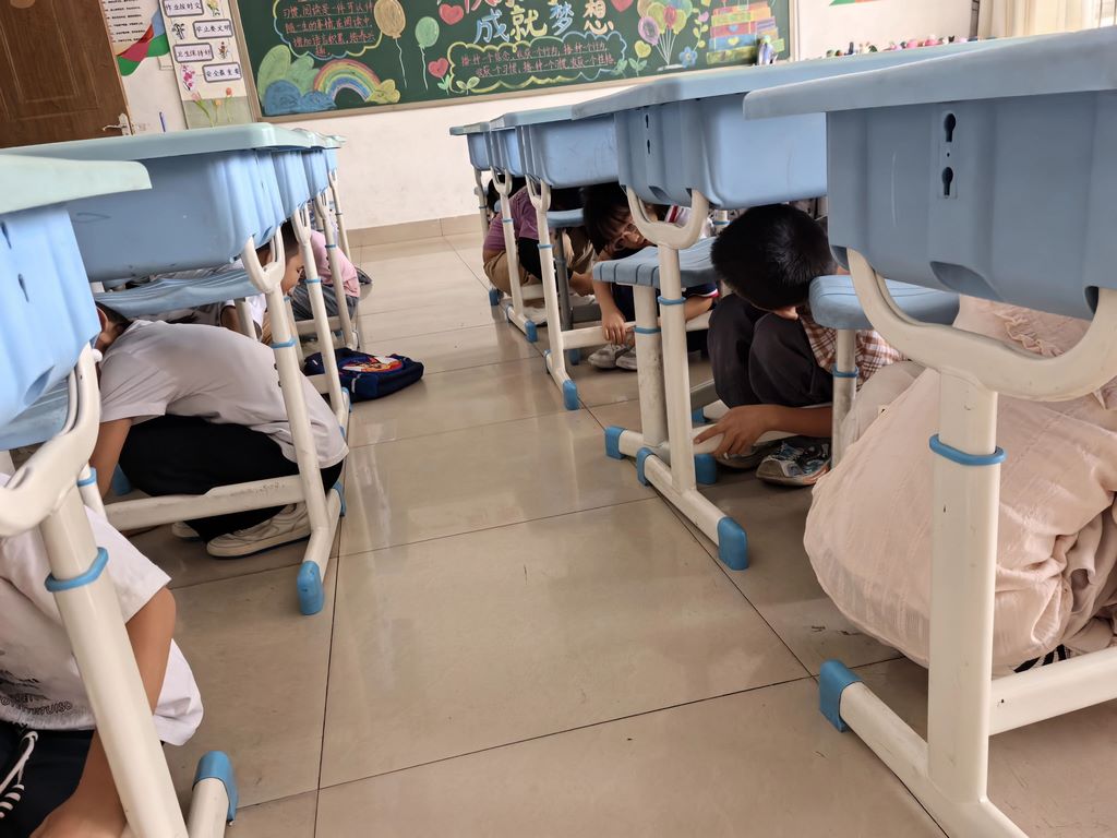 第一声哨声响起,地震应急避震环节正式启动。学生们迅速躲到课桌下方,以标准姿势完成应急避险。第二声哨声吹响,学生们在老师的引导下,沿着预定疏散路线快速、有序地撤离至教学楼前操场。整个过程紧张而不慌乱,充分展现了师生良好的应急素养。