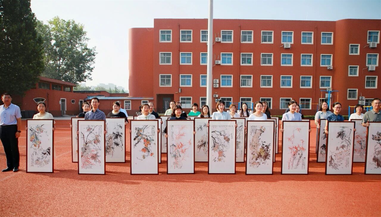 升旗仪式落幕,“我为圣中代言”征文颁奖环节随即展开。主持人介绍此次建校30周年征文活动的背景、意义并宣读一等奖获奖情况,由礼仪人员引导获奖教师上场,学校党委书记朱荣光、中国美术家协会会员孙明军为一等奖获得者颁发画作。三轮颁奖结束后,全体获奖教师与颁奖嘉宾共同合影。