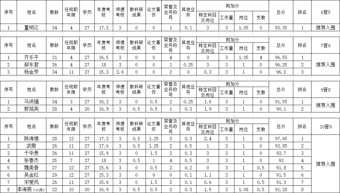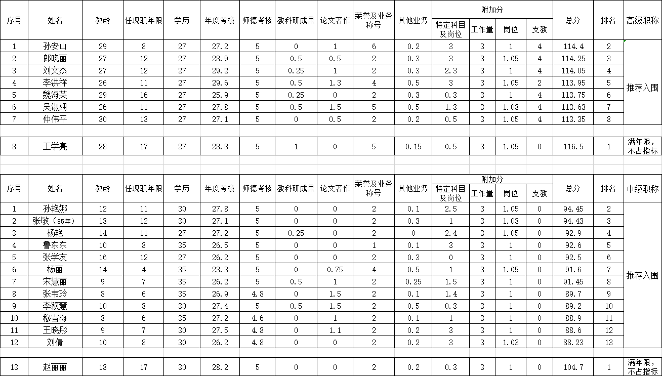 根据市职称工作安排,我校参与2025年度职称竞聘人员,通过个人申报、递交材料、职称评审委员会组织评审、个人积分确认等流程,最终将高级、中级职称及专业技术岗位竞聘推荐人选公示如下,请予以监督,如对公示人员有问题反映,请于公示期内以电话或邮件反馈。电话:15166367693 邮箱:916512615@qq.com
