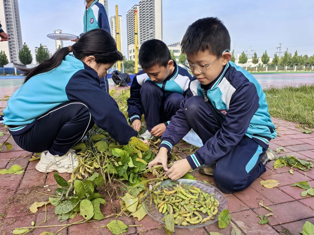 随着一声令下,各班的“田园合伙人”欢呼着进入指定地块。在老师的悉心指导下,孩子们弯下腰,小心翼翼地采摘毛豆植株。他们分工协作,有的负责采摘,有的负责搬运,有的负责整理,确保每一株毛豆都能完整地归入本队的收纳筐中。田间地头,劳作的小身影与绿油油的豆株构成了一幅幅最美的秋收图景。