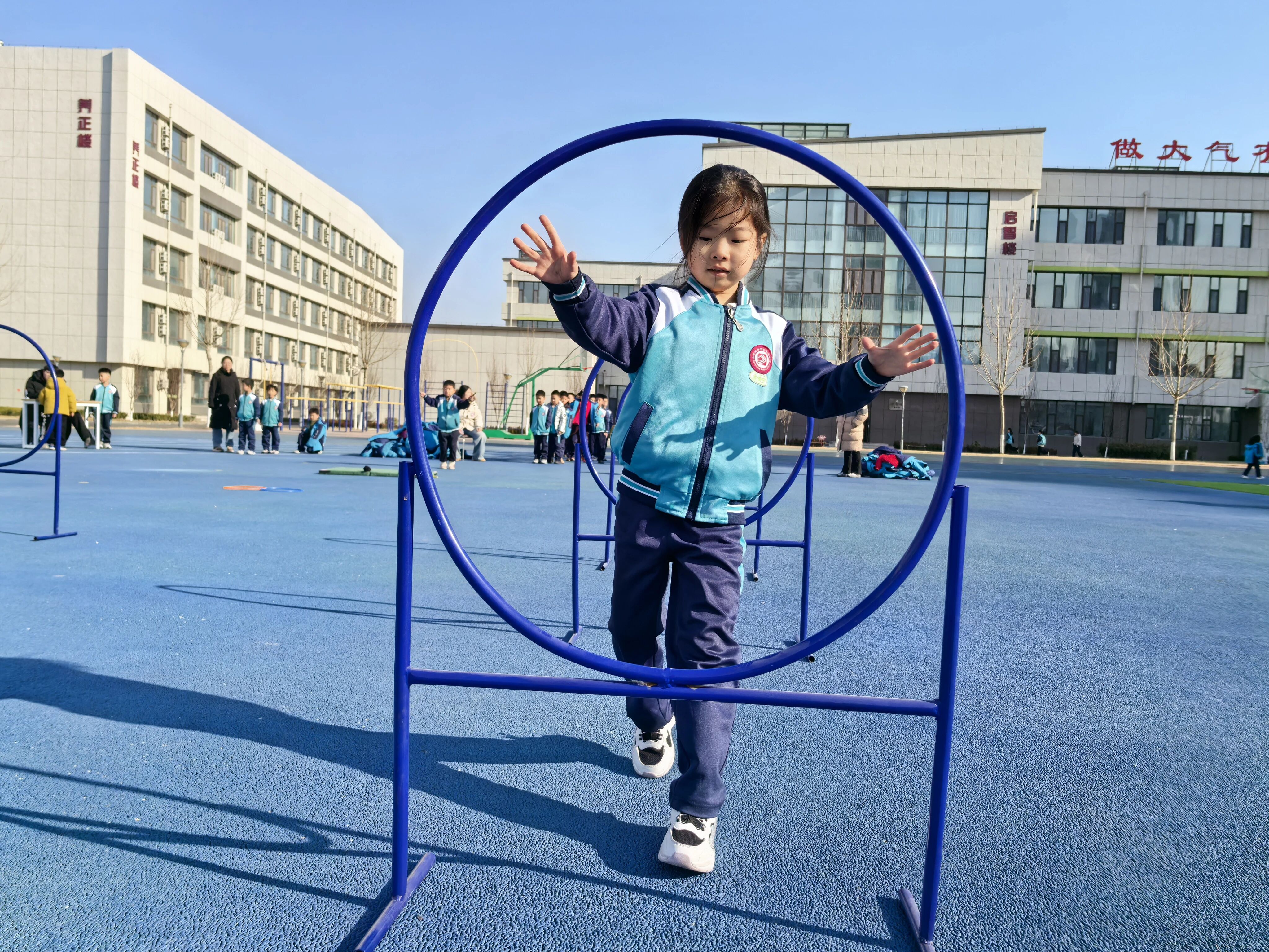 学生们手持闯关卡,化身为小勇士。他们在轻跃云阶蜻蜓点水中测试身体的灵巧,在绳彩飞扬锦袋入环里锻炼手眼的默契,在勇攀高峰”“平地纵跃时爆发力量与勇气,在空中飞跃星球争霸中培养团队协作。整个操场化身为欢乐的海洋,加油声与欢笑声交织,孩子们在自主挑战中完成了对自我能力的发现与肯定。