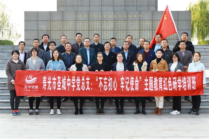 在牛头镇抗日武装起义纪念碑前。大家认真听取了教官对寿光红色峥嵘岁月的介绍。面对鲜艳的党旗,全体党员教师举起右拳,庄严宣誓,重温入党誓词,缅怀革命先烈,牢记入党初心,勇担历史使命。