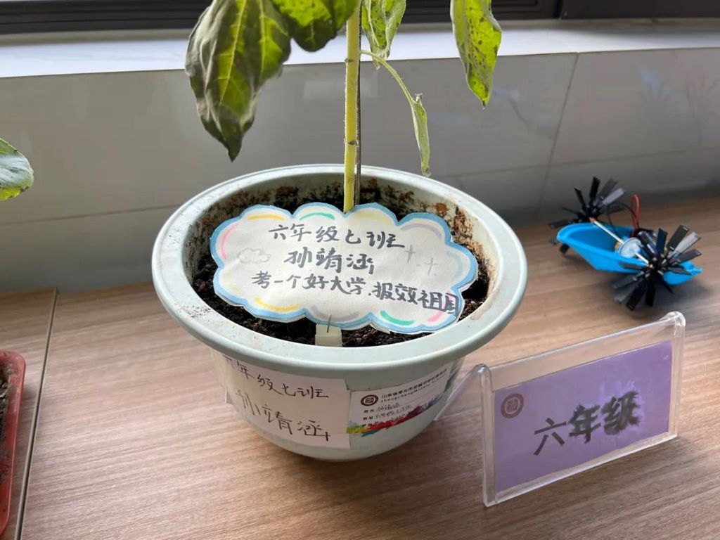同学们将种子带回家后,先了解了种植葵花的一些知识,然后精心挑选了适合种子生长的土壤和花盆,亲手将种子种下后,又写下自己的心愿卡片。每天观察种子的生长情况,记录到实践报告上。在养护葵花发芽、长大、开花的过程中,老师们适时对学生进行了劳动技能、生物知识、写作表达等知识的讲授,并有机融入爱国教育。针对种植失败的同学,开展了“葵花向阳、我心向党”的伟大建党精神教育,为学生讲解我党发展过程中遇到挫折但越挫越勇的历史事件,让他们正确认识种植的成功或失败。在举办“葵花种植展览”活动时,学生们争先恐后地将自己的“劳动成果”带到学校,并分享自己种植过程中遇到的问题和收获。