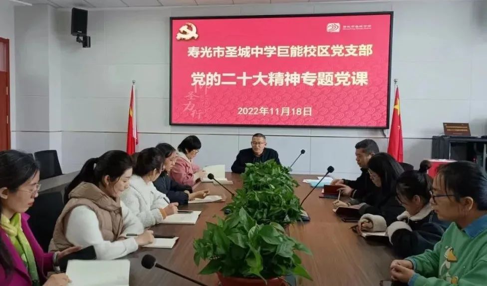 为学习贯彻党的二十大精神,促进教育高质量发展,11月18日,圣城中学巨能校区党支部开展党的二十大精神专题党课,全体党员参加。寿光市委教育工委兼职组织员、学校党委委员、副校长曹国栋作专题党课辅导,学校党委委员、巨能校区党支部书记、执行校长张海艳主持。