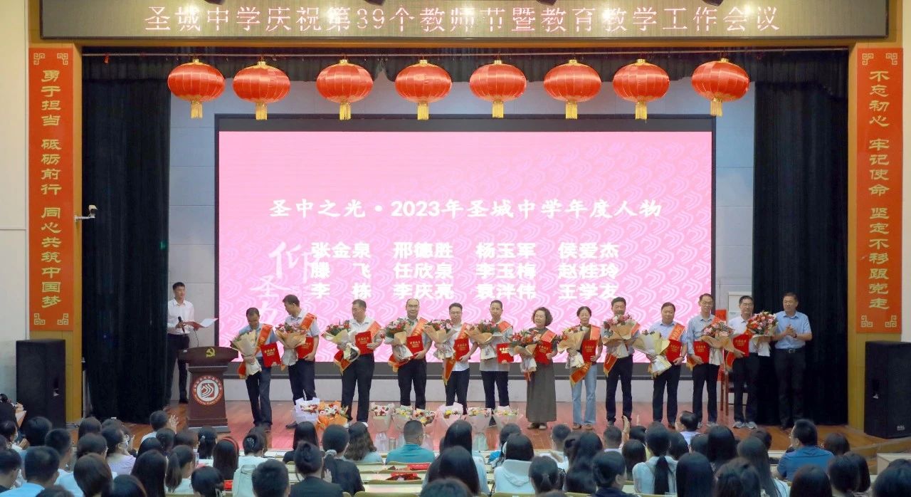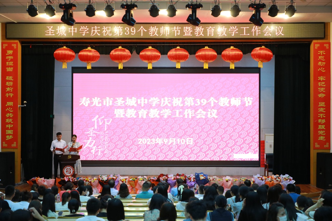 为庆祝第39个教师节,贯彻落实上级教育教学工作会议精神,充分发挥老教师和骨干教师的示范引领作用,促进青年教师在层级发展中迅速提升,打造一支高素质、有活力、有干劲的教师队伍,9月10日晚,圣城中学在阶梯教室举行庆祝第39个教师节暨教育教学工作会议,全体中层以上干部、班主任和获奖表彰教师参加。
