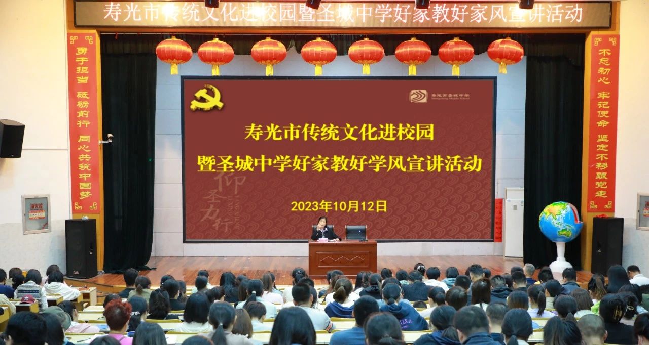 为进一步弘扬中华民族优秀传统文化,引导家长为孩子塑造良好家庭环境,给孩子养成良好的品行,10月12日,圣城中学在阶梯教室举行了寿光市传统文化进校园暨圣城中学好家教好学风宣讲活动,学校邀请到了寿光市传统文化志愿者讲师团负责人、原寿光市政协党组副书记王春吉同志,并请讲师团讲师李桂云老师,给一年级的家长们进行了精彩的分享,共260人参加。
