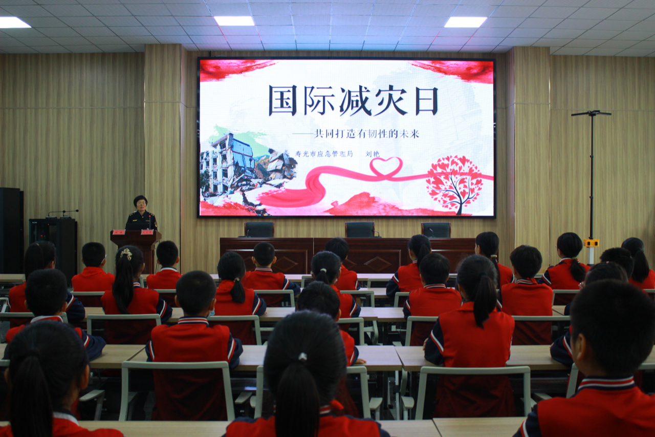 最后,由寿光市应急管理局的刘艳为同学们带来了精彩的宣讲,带领同学们了解了“国际减灾日”,并教会了学生应对自然灾害的方式方法。