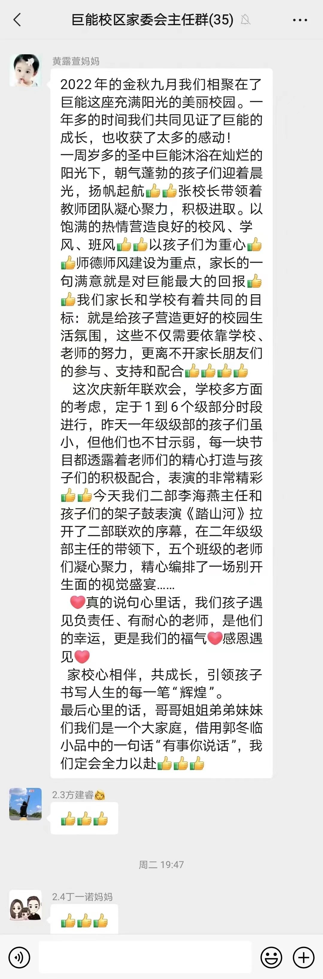 近日,为方便学生“庆元旦”活动的开展,给每个学生搭建展示自我的舞台,圣城中学巨能校区分级部错时举行元旦汇演展示。各班部分家长也参与到活动中,与孩子们一起,共同度过了快乐的一天,留下了美好的回忆。活动过后,家长们纷纷表达了对学校工作的支持与认可。