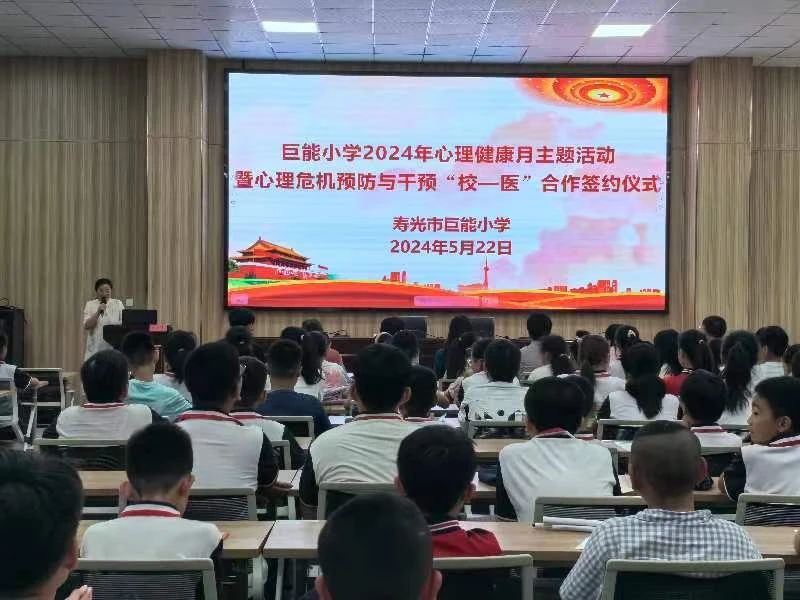 为推动学校学生心理健康服务体系建设,助力学生有效应对学习与生活中的各种挑战,5月22日下午,圣城中学巨能校区举办心理健康专题宣讲暨心理危机预防与干预“校—医”合作签约仪式,寿光市精神卫生中心副院长王勇、心理科主任杨立平、圣城中学副校长张海艳、四五年级全体师生共160人参加活动,课程教学中心主任武林霞主持。