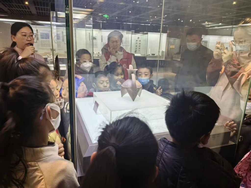 现场讲解员结合寿光市博物馆内的实物图片与趣味故事,依据馆藏文物特色,以时间为顺序,以文物、人物为引线,展示了寿光自远古时期至清代不同时期的历史文物、重要人物和重大事件,梳理了寿光从新石器时代聚居、商周盐业重镇到唐宋明清农耕繁荣的历史脉络。