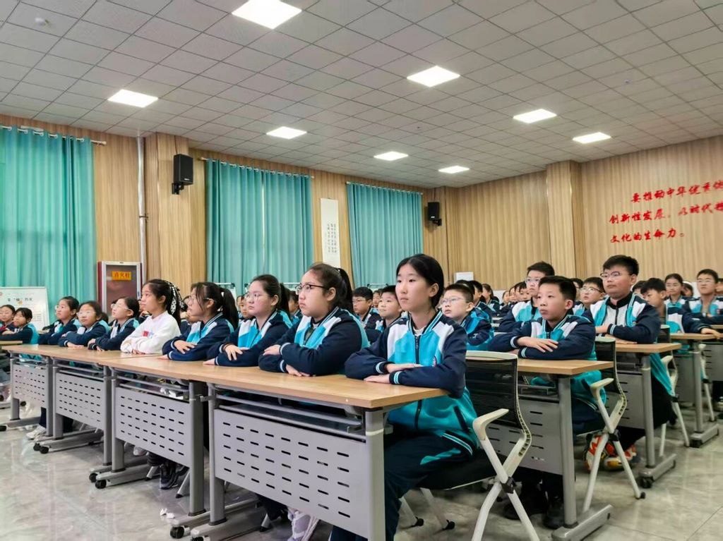 活动的最后,迎来了最为庄严和激昂的时刻。在孙科长的带领下,全体同学肃然起立,共同许下了一份沉甸甸的安全承诺。铿锵有力的誓言在校园里回荡:“从我做起,拒绝欺凌,文明上网,遵守交规,争做平安校园的守护者!”这不仅仅是一句口号,更是全体同学将课堂知识内化为行动信念的见证。在孙科长的引领下,这次宣誓为整个宣讲活动画上了一个圆满的句号,也将整场活动的氛围推向了最高潮。